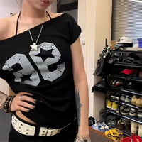 Off-Shoulder Y2K Print T-Shirt